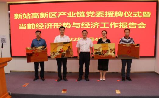 2022年8月,新站高新區舉行產業鏈黨委授牌儀式暨當前經濟形勢與經濟工作報告會,圖為區黨工委委員、管委會副主任高同國向區集成電路、新型顯示、高端裝備制造、節能環保四大產業鏈黨委授牌